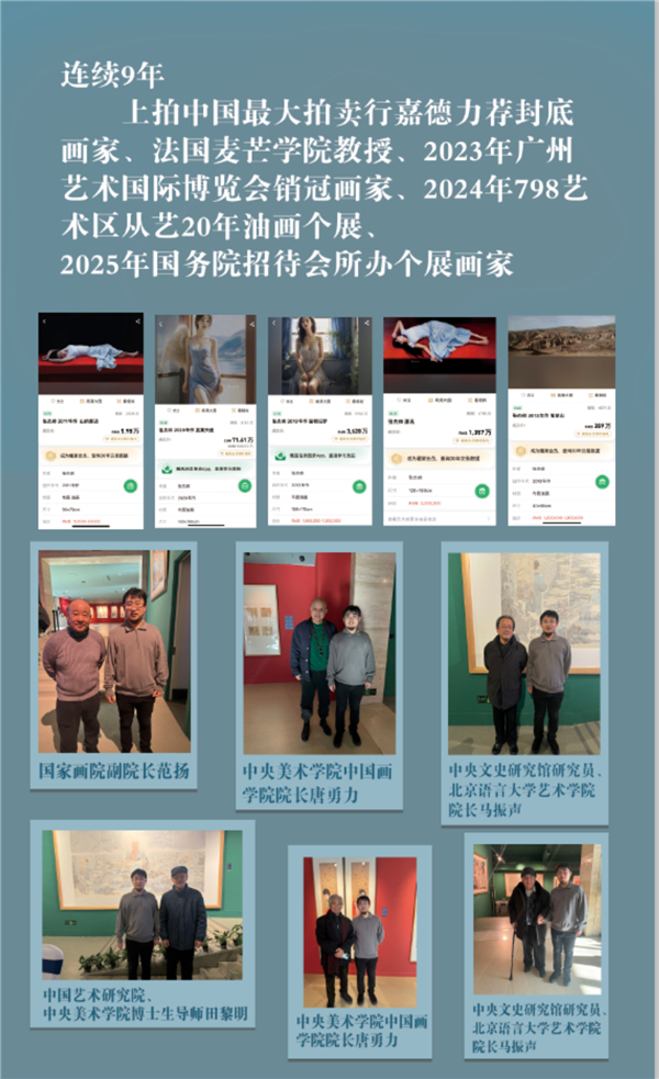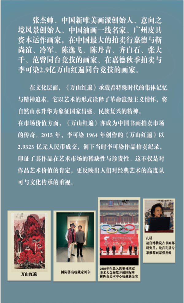 ![]() 张杰帅,广州美术学院毕业,中国著名新唯美主义画家,新理想主义画家,中国新唯美画派创始人,意向之境风景创始人,张杰帅艺术馆馆长。 国务院招待会所展览现场 ![]() ![]() ![]() ![]() ![]() ![]() 中文名:张杰帅、职业、画家》 代表作《择日》《二亲的小世界》《阿零》《在世界的另一边看你》《日落我心》《山的那边》《我有我梦》《寒风微叶》《月晓之滨》《君》《月音》《月鸣》《窗棂旧梦》《何昔》《日落我心》 相关展览 2025年国务院招待会所个展 2024年 新意象油画双年展 2023年 广州国际艺术博览会 2022年 798艺术区张杰帅从艺20年回顾展 2020年 俄罗斯圣彼得堡张杰帅艺术回顾展 2019年 新加坡张杰帅个人艺术成就展 2018年 青岛、上海、杭州、广州、北京巡回展 2017年 广州国际艺术交易博览会,架上绘画三年之约邀请展 2017年 学院之光30+30嘉菁英特展(绘的震颤.画的呼吸 架上的回归) 2016年 北京宋庄雅文画廊“写实.和而不同”——油画、雕塑作品联展 2015年 北京国际饭店预展 2014年 北京中华世纪坛“现实与憧憬”写实油画展,抽象之像油画大展 2013年 广州市青年写实油画大展,爱的勃发“羊城精英”油画展 2012年 北京国际饭店展览,大艺网大学生艺术作品展,“新时代、新写实”油画邀请展 2011年 北京国际饭店中国嘉德拍卖预展 2010年 中国嘉德拍卖预展 2010年作品《避风港》《白昼的月亮》深圳柠檬画廊精英展 2009年 作品《避风港》“恋爱至上”油画展 2008年 作品《期待》受邀奥林匹克美术大会大学生艺术展,并获奖 2007年 作品《梦来》《醒去》“8点钟的太阳”作品展; 2007年作品《我有我梦》“岭南新势力”油画展 2006年中国大学生艺术年鉴,《我曾飞过》入选并获奖 作品欣赏 ![]() ![]() ![]() ![]() ![]() ![]() |