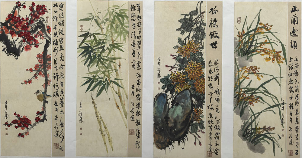 领导嘉宾参观展览 展览现场,多幅袁存建的佳作引发了观众的热烈关注与深度探讨。梅兰竹菊四条屏各具风骨又浑然一体:寒梅以枯笔皴擦出老干虬枝,几点朱砂点缀出傲雪精神;幽兰以淡墨勾勒出空谷遗韵,叶片的飞白处理尽显飘逸之姿;修竹以中锋运笔展现劲节虚心,疏密有致的布局暗合音乐节奏;秋菊则以泼彩技法渲染出金甲凌霜的气势,花瓣的层次变化彰显大家手笔。这组作品不仅是对传统"四君子"题材的当代诠释,更是艺术家将个人品格与民族气节熔铸于笔墨的巅峰之作,每幅画面都跃动着中华文化的精神密码。