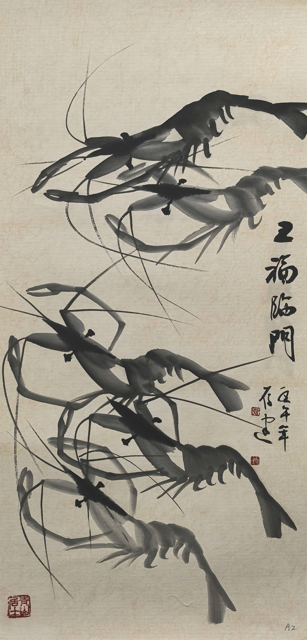 袁存建以齐派技法为根基,却突破传统程式化表达。画面中五只墨虾形态各异,或弓背跃动,或触须轻探,通过墨色的浓淡干湿变化,将虾壳的透明质感与游动的动态完美呈现。尤其值得注意的是,艺术家刻意弱化背景留白,使观者的注意力完全聚焦于这些水中精灵的灵动之姿。这种"减法"处理,恰恰展现了大师对艺术本质的深刻理解——真正的生动不在于繁复的描绘,而在于对生命本质的精准捕捉。