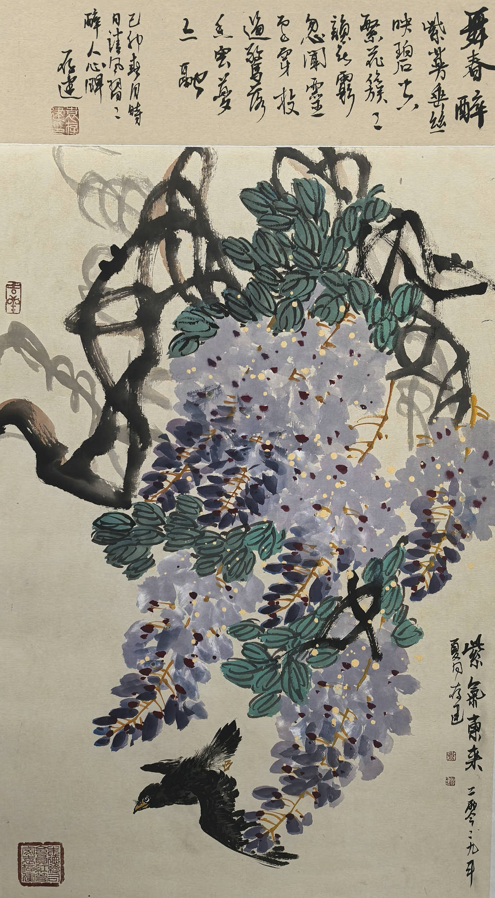 紫藤垂蔓的柔美与苍劲的老干形成鲜明对比,袁存建以泼墨与勾勒的巧妙结合,营造出虚实相生的意境。淡紫色的花瓣如云雾缭绕,虬曲的枝干似蛟龙盘旋,刚柔并济中透露出东方美学的哲学思考。这幅作品超越了自然景物的描摹,成为艺术家对生命轮回的诗意诠释——在看似柔弱的藤蔓间,蕴藏着生生不息的永恒力量,让观者在静谧中感受到自然的呼吸与韵律。