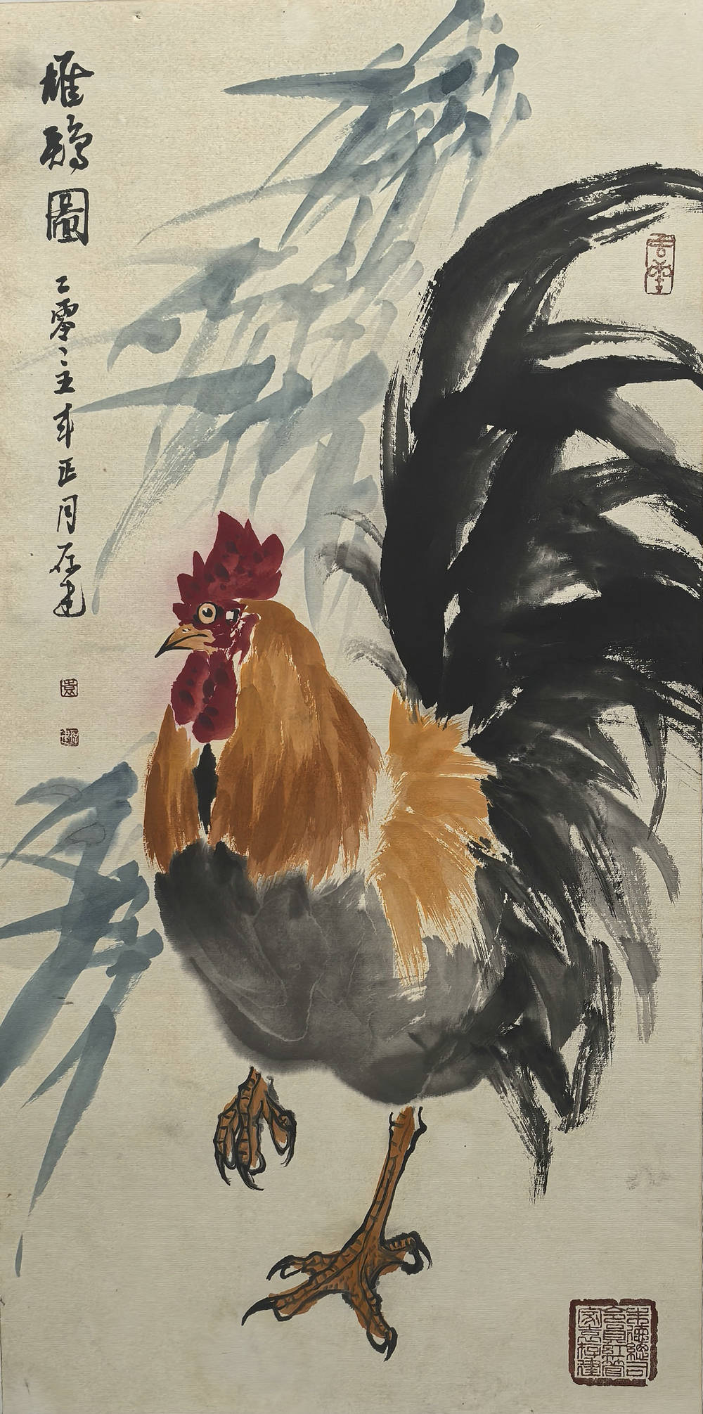 袁存建笔下的雄鸡,以遒劲的笔锋勾勒出昂扬的姿态。鸡冠如燃烧的火焰,尾羽似飘扬的战旗,每一根羽毛都蕴含着蓬勃的生命力。这幅作品突破传统工笔的细腻,以大写意的豪放笔触,将雄鸡的精气神凝练于方寸之间。观者仿佛能听见黎明时分那声划破长空的啼鸣,感受到一种穿透时空的奋进力量——这不仅是自然生灵的写照,更是中华民族崛起精神的象征。