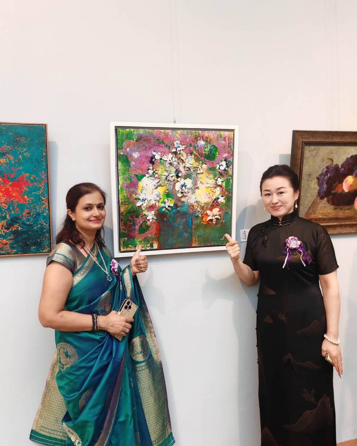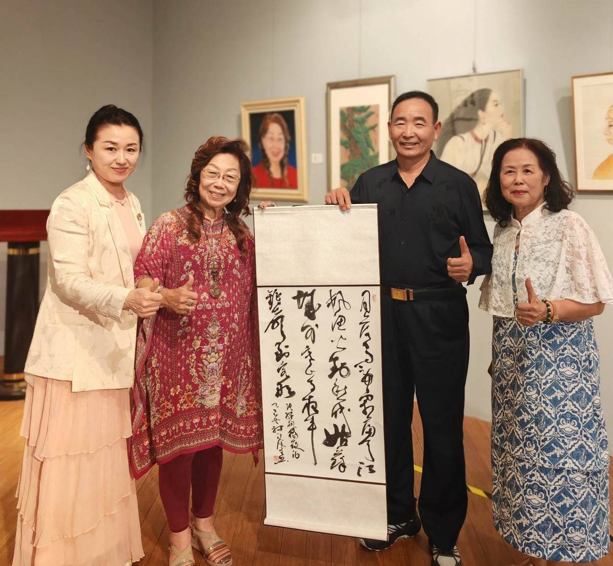 新加坡妇女艺术协会会长林秀鸾女士与中国书画家联谊会女书画家工委会主任高禹劼女士互赠礼物。