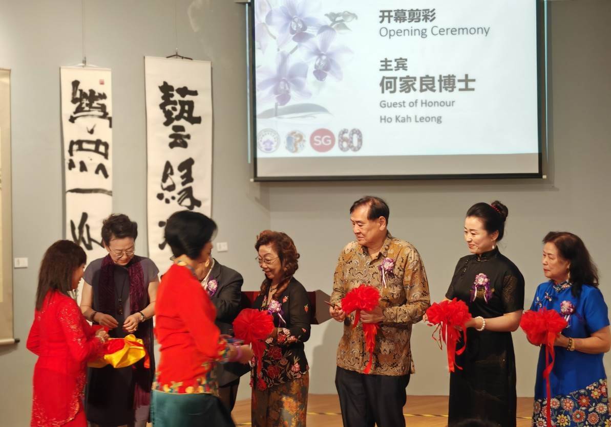 驻新加坡大使夫人杨青女士、何家良博士 、林秀鸾会长、张绍平先生、高禹劼主任、张琼如副会长、朱绍瑛会长、陈爱萍教授共同为展览剪彩。本次国际艺术交流展的成功举办,将会繁荣两国文化市场,是两国艺术家相互学习、相互交流的重要举措,也是贯彻两国关于“文明互鉴和文化交流”战略的具体行动。